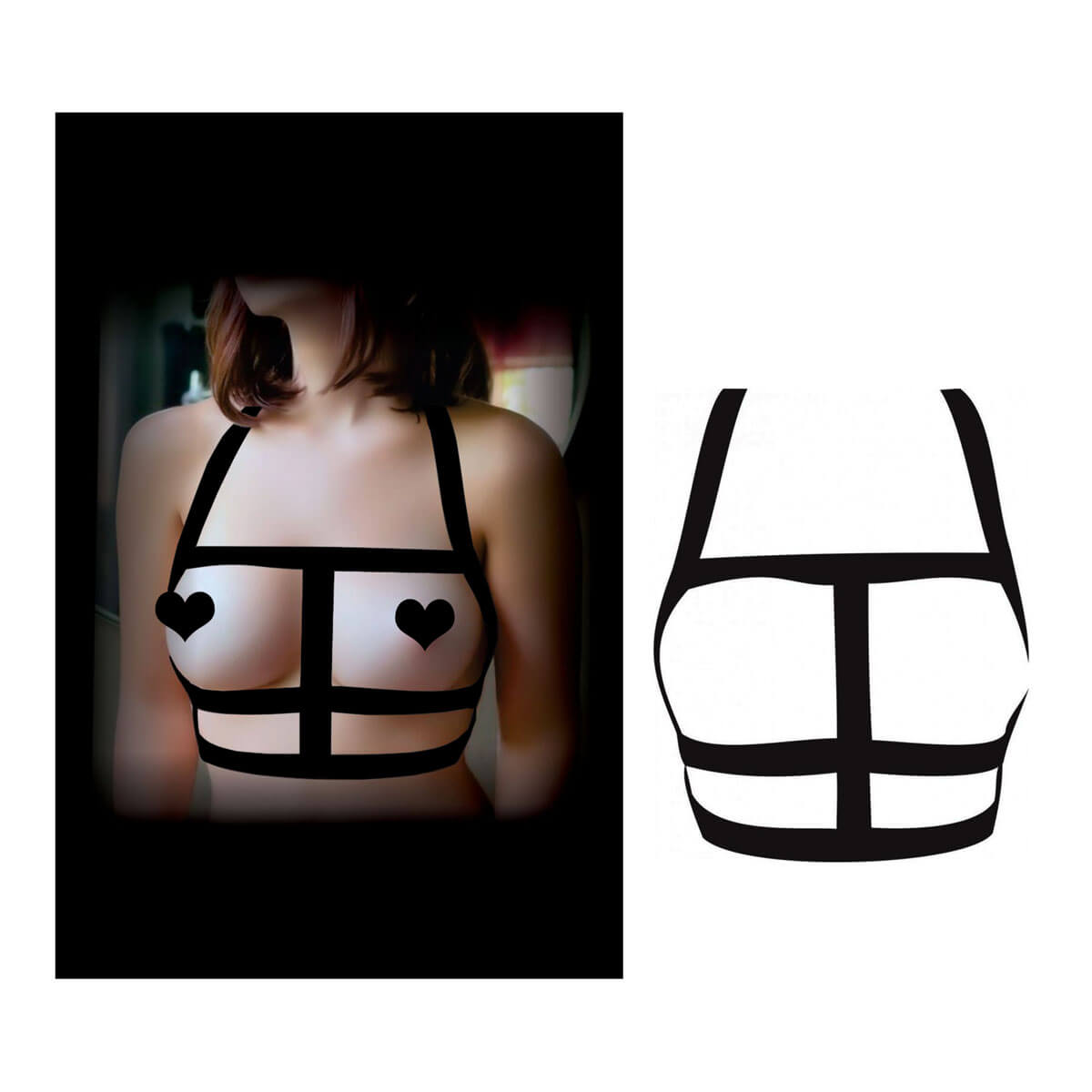 Arreio feminino em couro ecológico com formato retangular, detalhes de rebites com separador de seios e fecho ajustável. Chega mais!