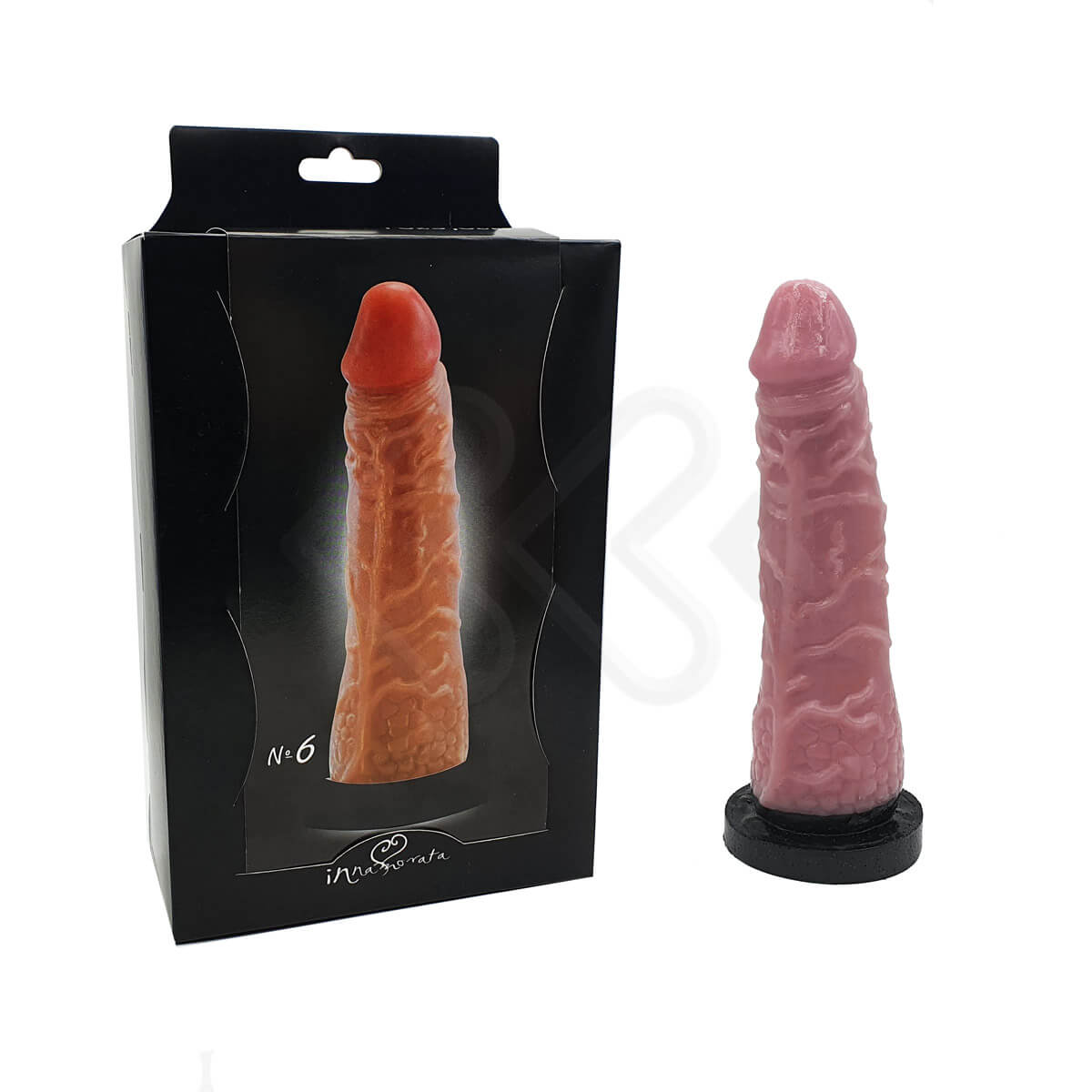 Prótese peniana, feita em silicone no formato realístico com glande definida, veias salientes, cerdas estimuladoras inferiores e base achatada para cintas penianas.