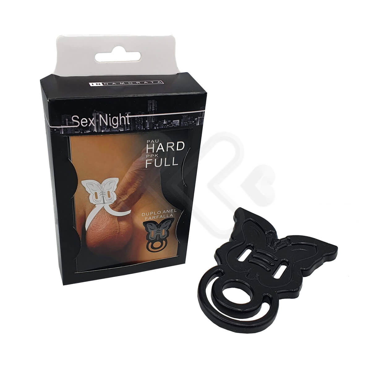 Anel peniano duplo á prova de água, no formato de borboleta em silicone vulcanizado com texturas massageadoras, encaixe o pênis e outro para escroto. Chega mais!