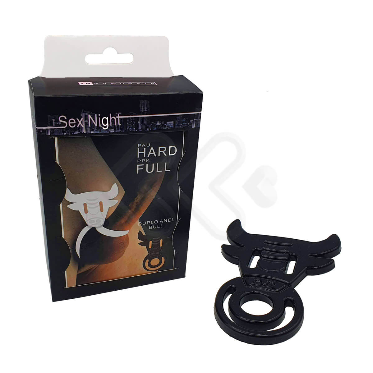 Anel peniano em silicone vulcanizado de material flexível no formato de touro com texturas massageadoras, encaixe para o pênis e para o escroto.