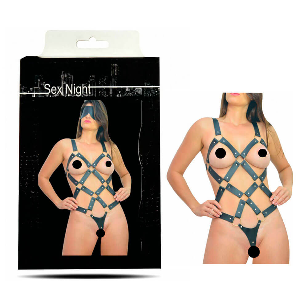 Arreio feminino "Sex Night" confeccionado em couro ecológico com argolas sobre a peça e detalhes em rebite. Acompanha uma linda venda com elástico ajustável.