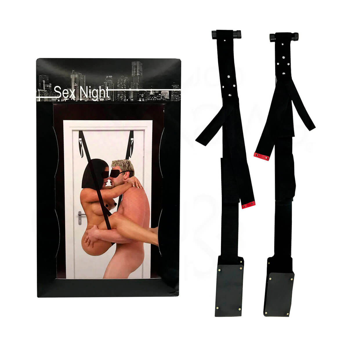 As pontas possuem prendedores para ser aplicado atrás da porta e garantir segurança durante suas diversões. Contém puxador para as mãos, oferecendo suporte e apoio no uso. O assento é todo trabalhado em couro ecológico com detalhes de rebites, confortável e totalmente seguro.