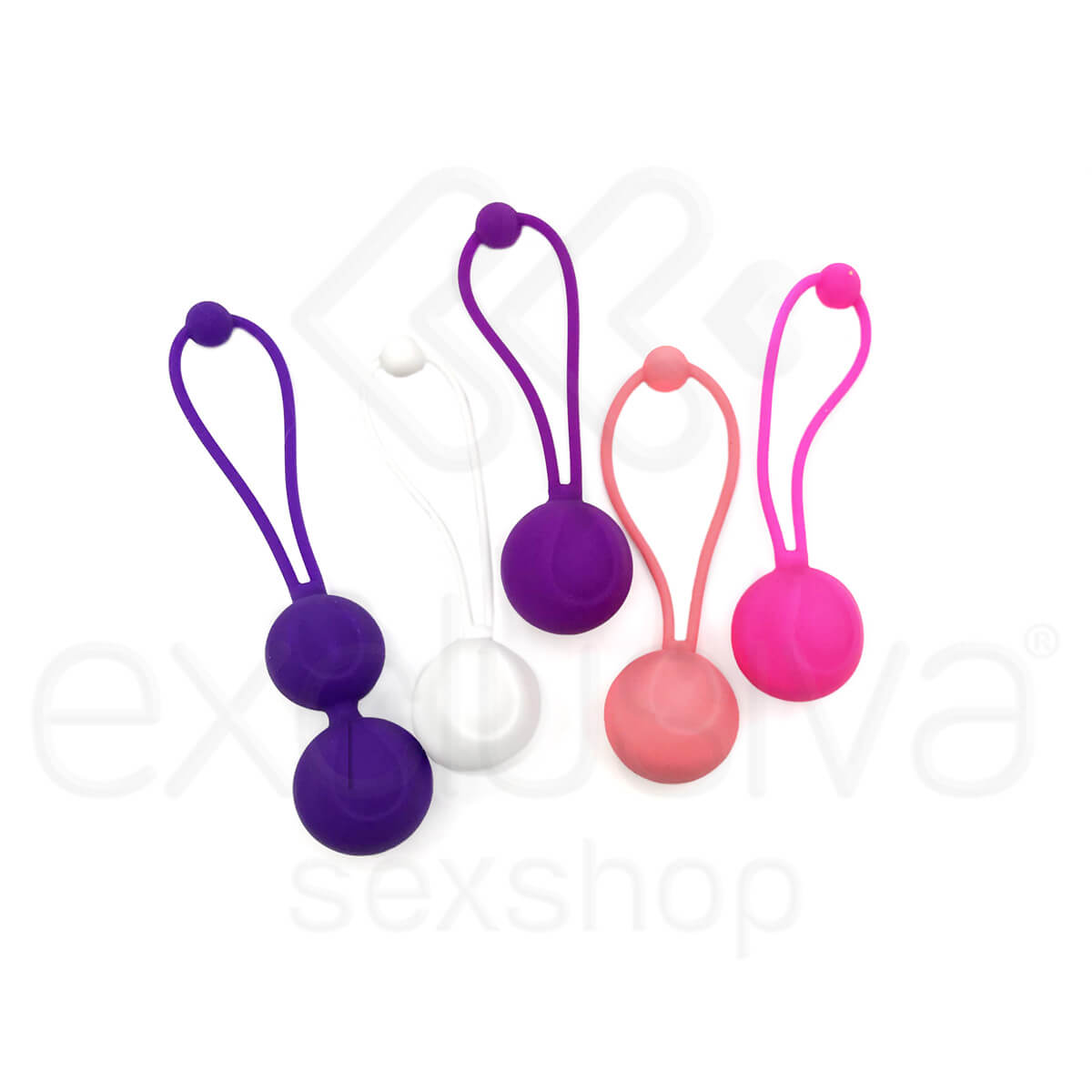 Kit com 5 cordões com pesos para você praticar o pompoarismo e melhorar tanto sua vida sexual, quanto sua saúde. Feito em silicone macio e com alça de segurança.