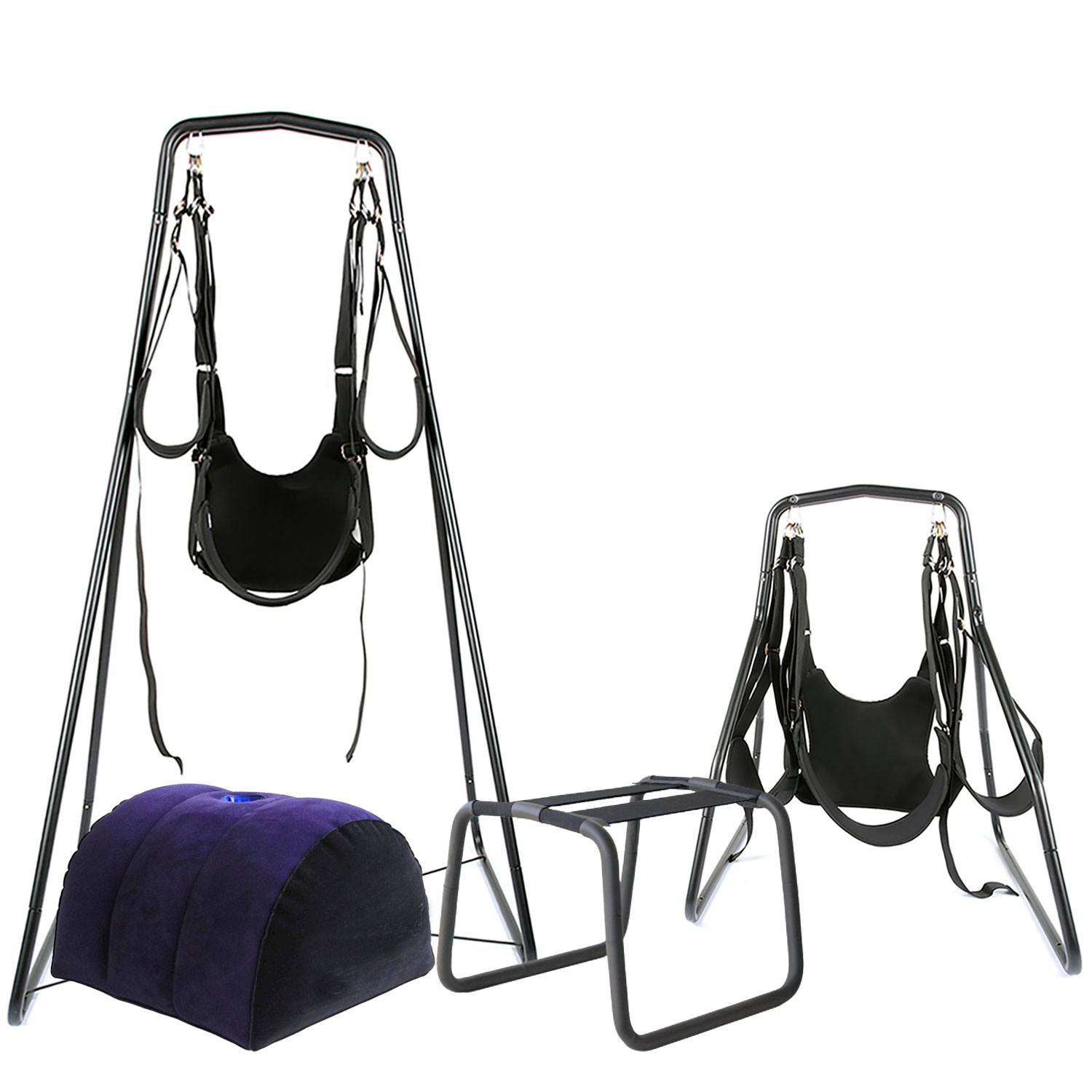Kit maravilhoso para quem já tem experiência no BDSM. Com 2 balanços suspenso, cadeira erótica para posições sexuais e um puff inflável para varinha mágica! Todo produzido em nylon resistente e confortável nas cordas para imobilização total nessa brincadeira boba e gostosa ;)