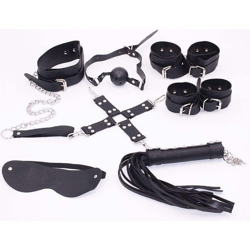 Kit Bondage composto por par de algemas, par de tornozeleiras, guia, coleira com corrente, chicote e mordaça.