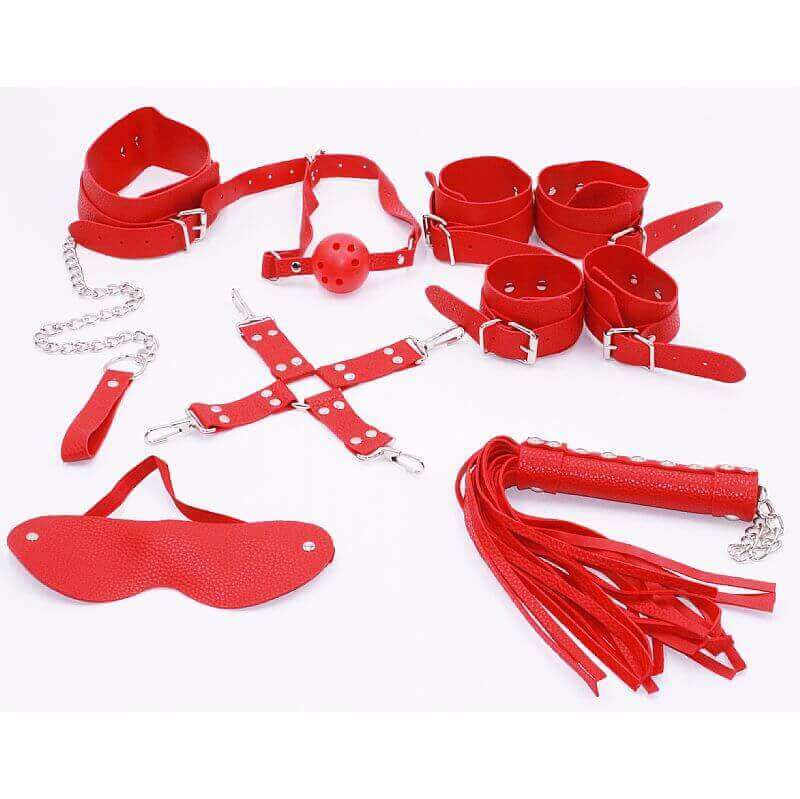Kit Bondage composto por par de algemas, par de tornozeleiras, guia, coleira com corrente, chicote e mordaça.