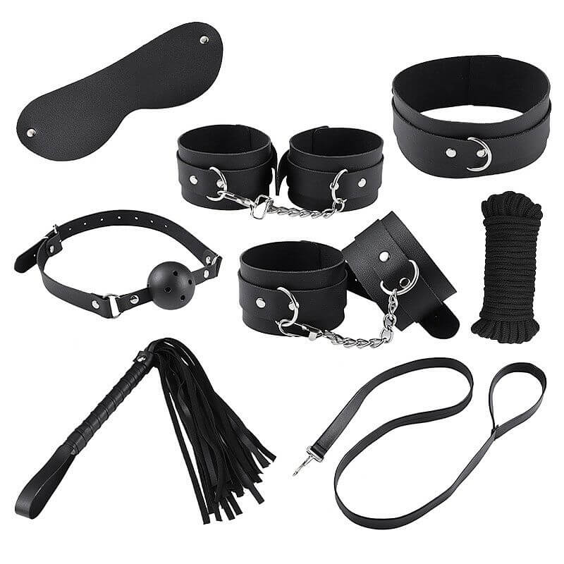 Kit Bondage composto por par de algemas, par de tornozeleiras, coleira com guia, chicote, mordaça e corda, tudo para deixar as noites mais apimentadas.