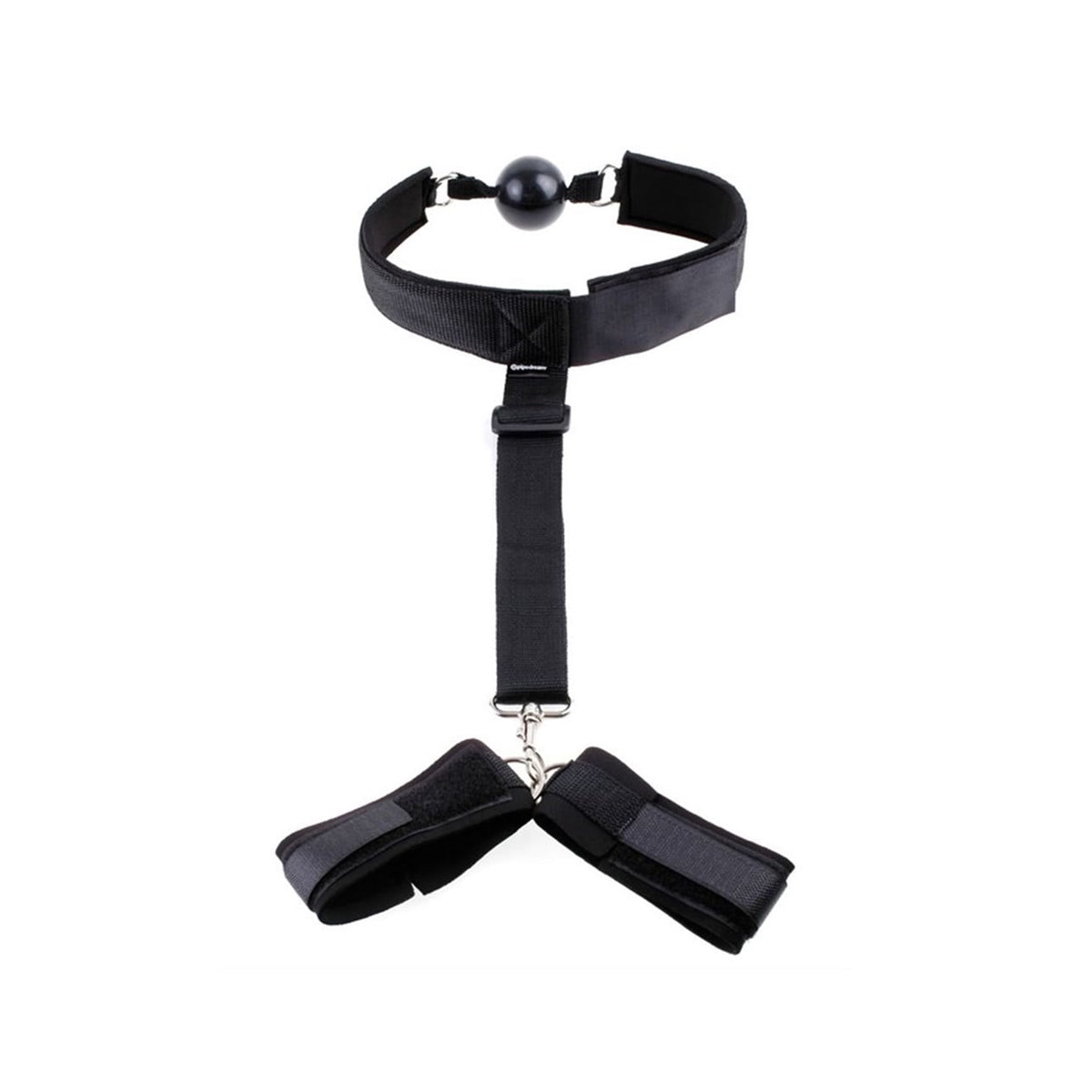 Kit com mordaça, com bola e algemas traseiras conectadas por tira ajustável em nylon. Ideal para provocar e explorar novas fantasias com segurança. Gostou? Vem aqui que te conto mais!