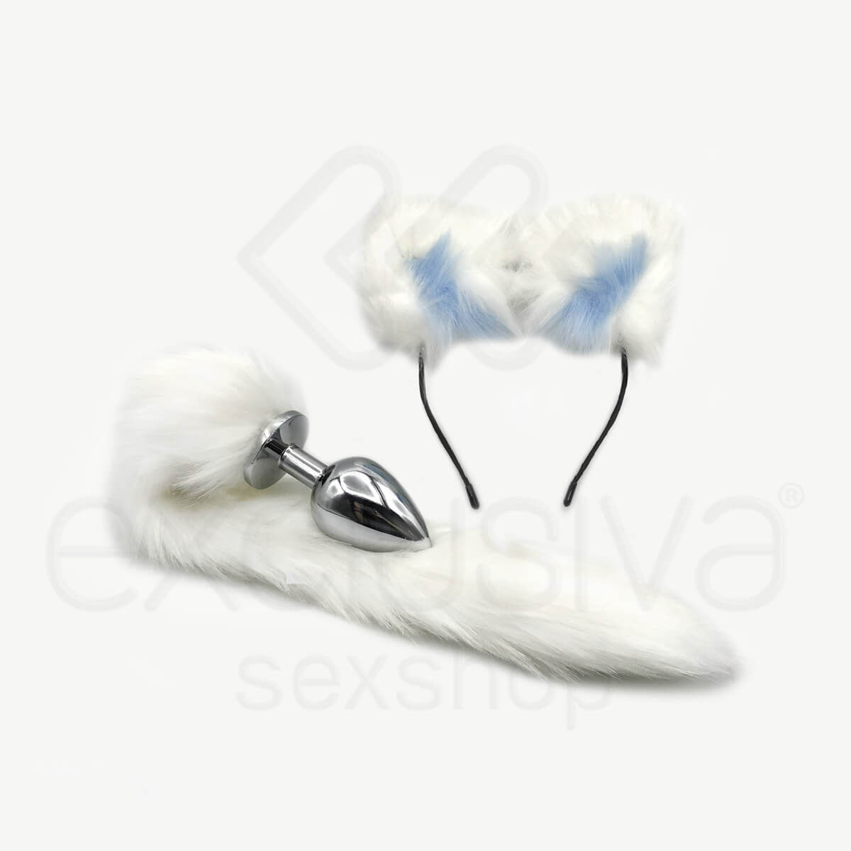 Kit composto por plug anal em metal com rabo artificial e tiara com orelhinhas de gatinha. Ideal para aperfeiçoar suas fantasias.