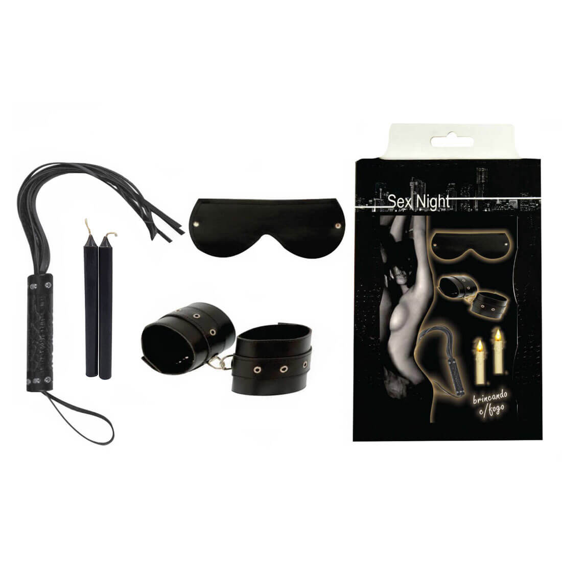 Kit para quem ama a prática do sadomasoquismo com chicote, venda para os olhos, algemas e velas. Perfeito para elevar o prazer dos seus fetiches!