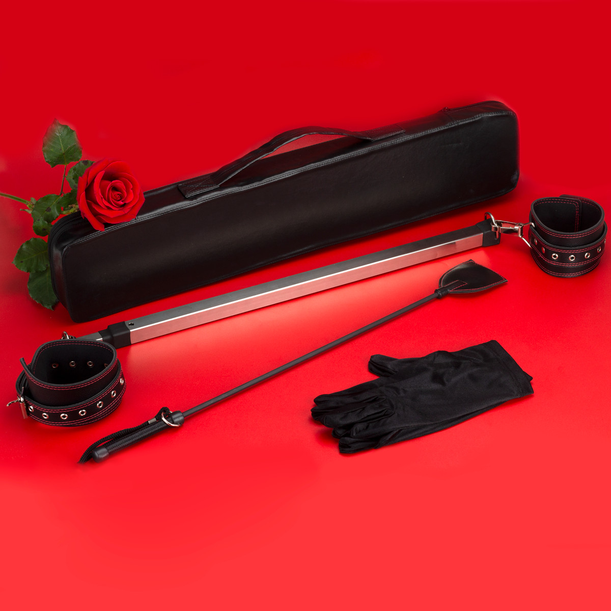 Kit Vampire Deluxe: 4 itens para dominar com intensidade: algemas, separador, chicote e luvas em couro. Seduza, controle e viva sua fantasia mais sombria!