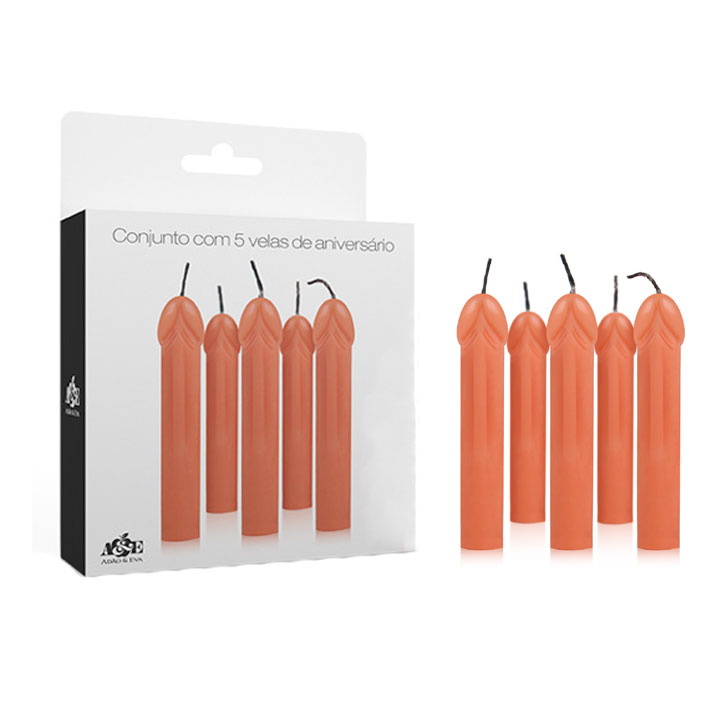 Kit com 5 velas em formato de pênis com glande definida para festas. Faça uma surpresa e sacaneie levemente seu amigo. Divirta-se!
