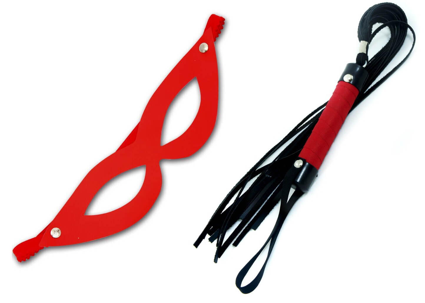 Kit Chicote e Máscara confeccionados em couro sintético, a chibata possui alça no cabo para facilitar o manuseio e a máscara possui rebites e elástico!