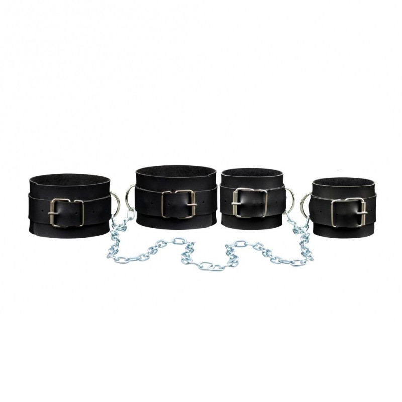 Algemas e Tornozeleiras feitas em couro sintético com detalhes em rebite, fivelas para ajuste e corrente em metal, que prende as peças entre si. Com a sua textura suave e resistência, ela permite que você explore diversas posições e crie um clima de intimidade e submissão!