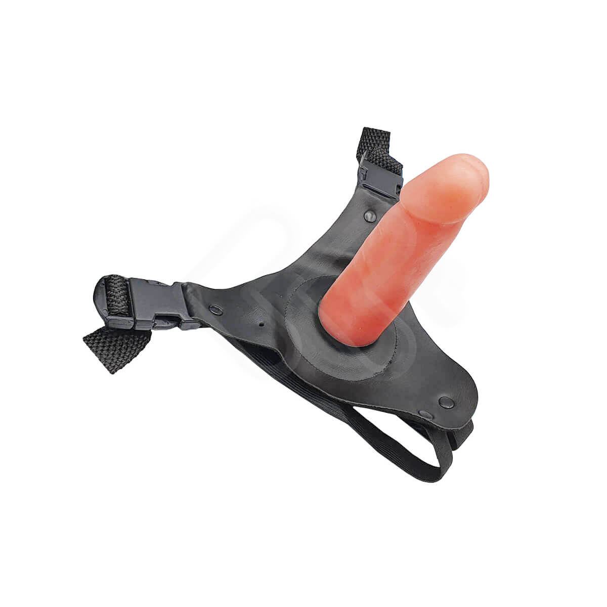 Cinta peniana feita de couro sintético com ajuste e pênis ultra realístico de PVC atóxico, fixado à cinta, com glande definida e liso, sem textura de veias.
