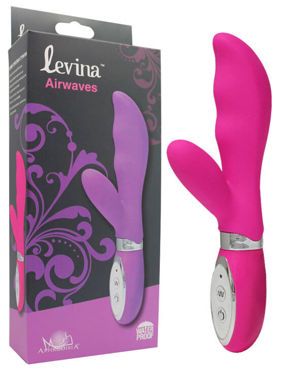 Vibrador estimulador de Ponto G com textura de ondas que estimulam o canal vaginal e estimulador clitoriano, fabricado em silicone suave ao toque.