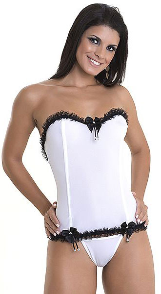 Lindo corselet Preciosa com detalhes rendados na borda e um lindo lacinho centralizado. Acompanhada de um calcinha branca super pequena e sexy, essa peça é a inovação tão esperada