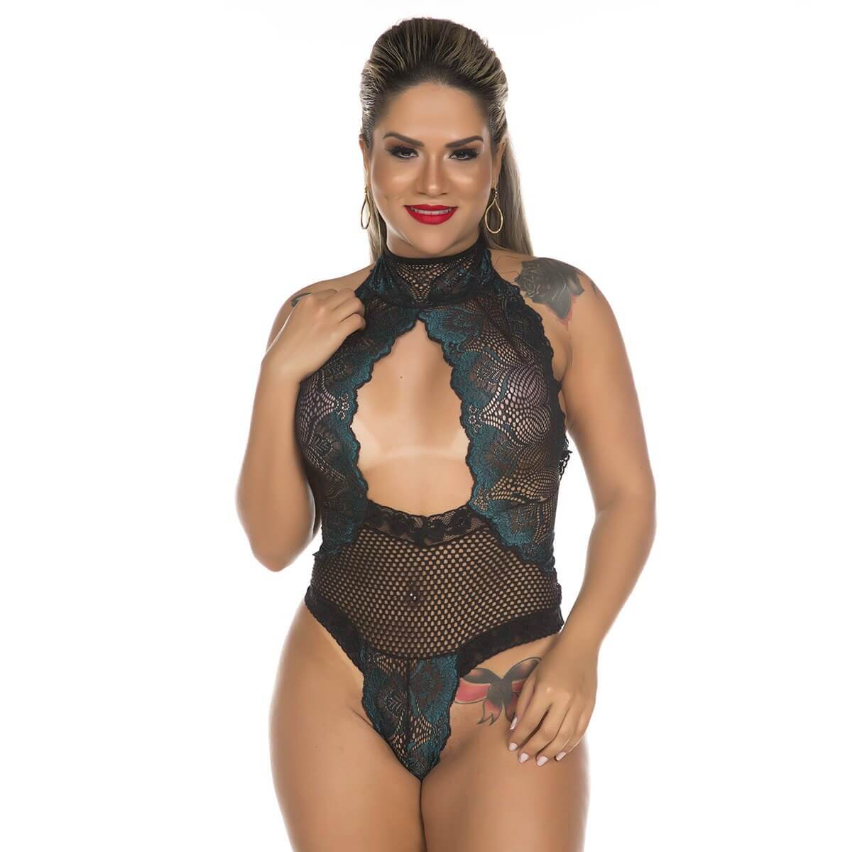 Body todo confeccionado em arrastão menor, com costas nuas, tiras em cetim para ajuste e decote nos seios deixando um decote lindo e super sensual! Desce aqui e confira essa belezinha!