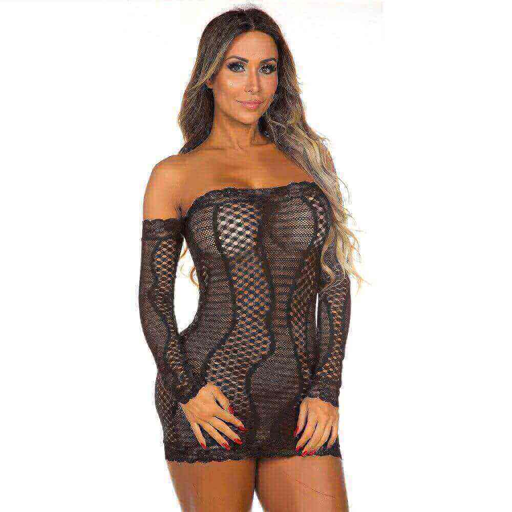 Camisola com manga ciganinha e leve transparência por toda peça. Acompanha ainda uma calcinha fio dental.