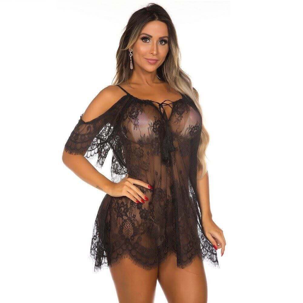 Camisola confeccionado em tule com renda e barra desfiada. Acompanha calcinha fio dental.
