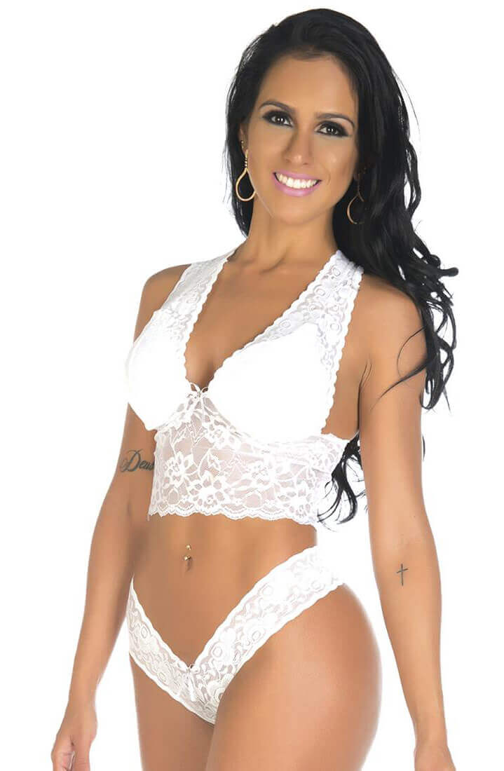 Conjunto Renda composto por sutiã e calcinha estilo asa delta confeccionados em renda. O sutiã possui lindo decote frontal e detalhe de alças trançadas nas costas.