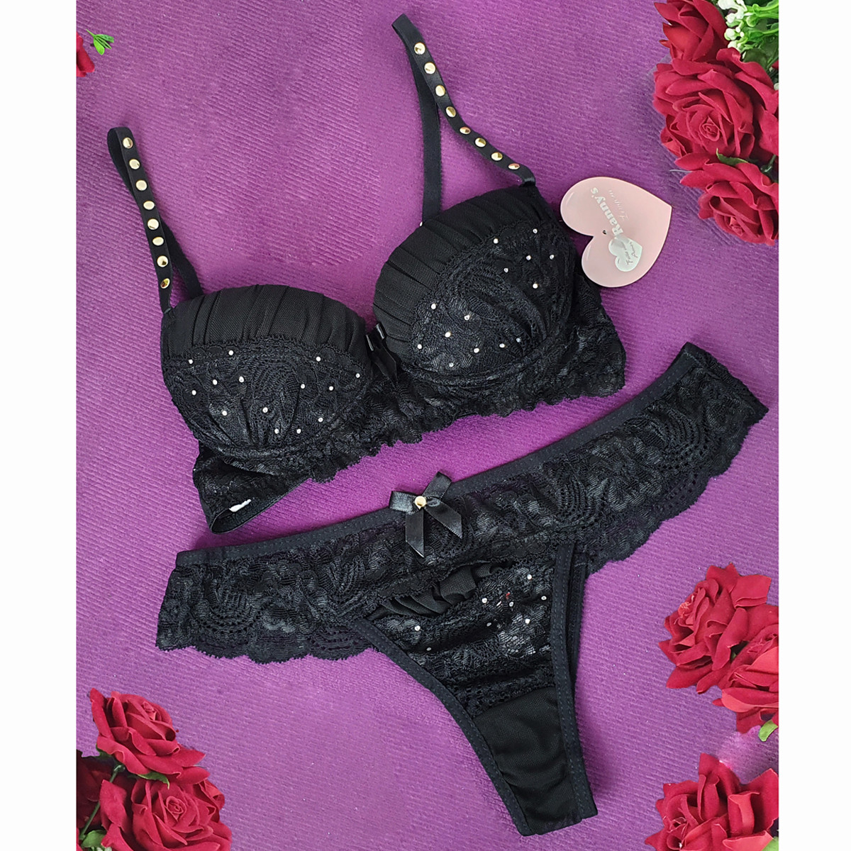 Lingerie Ranny's conjunto 1/2 Taça Rendada Spikes, confeccionado com detalhes em renda, alças em spikes e calcinha fio dental. Deixe qualquer um de queixo caído com este conjuntinho!