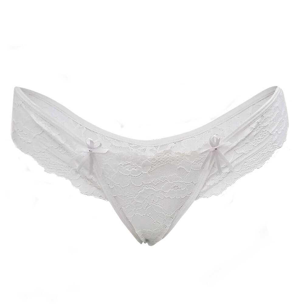 Calcinha Safira confeccionada em renda e tule com detalhe de laço em cetim.