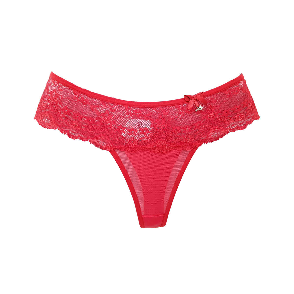 Calcinha Santropê confeccionada em renda e tule com detalhe de laço em cetim.