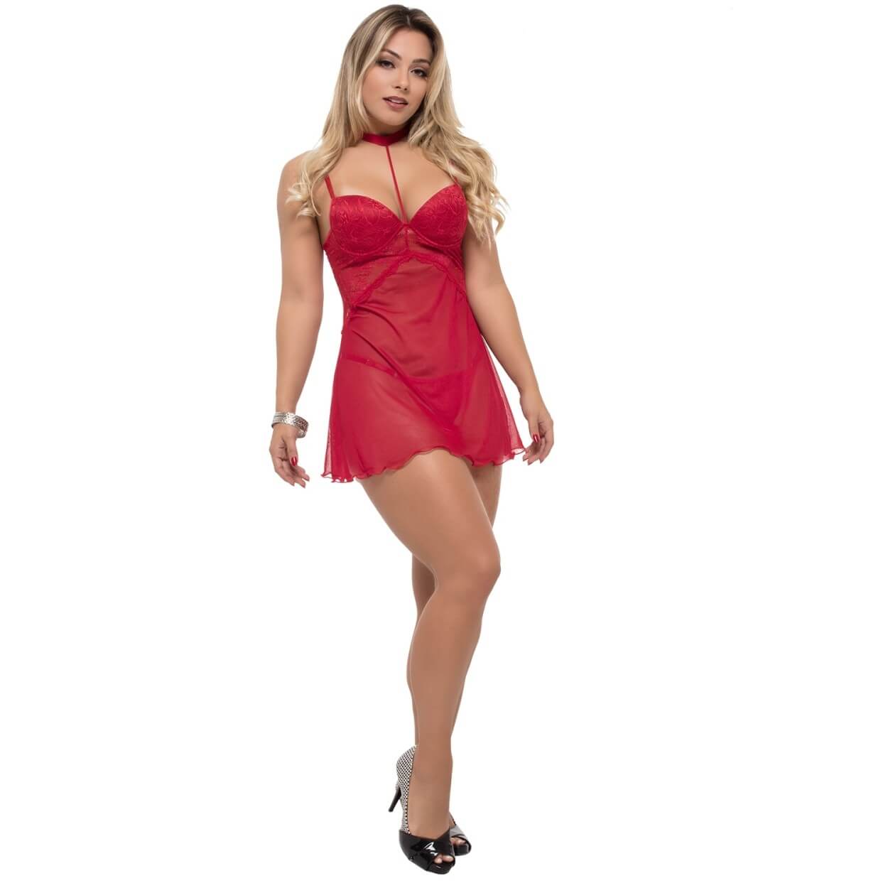 Camisola com renda comprida nas costas e mais curta na frente, tule pelo comprimento e calcinha fio dental com lateral ajustável.