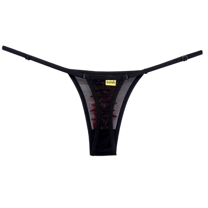 Calcinha fio dental confeccionado em tule transparente com detalhe em guipir e ajuste nas tiras laterais.