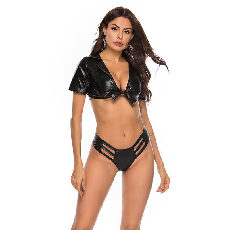 Conjunto composto por uma tanga com fendas e um cropped com amarração frontal. Ambos feitos em Spandex para você surpreender quem você mais ama. Role a página e veja mais abaixo!