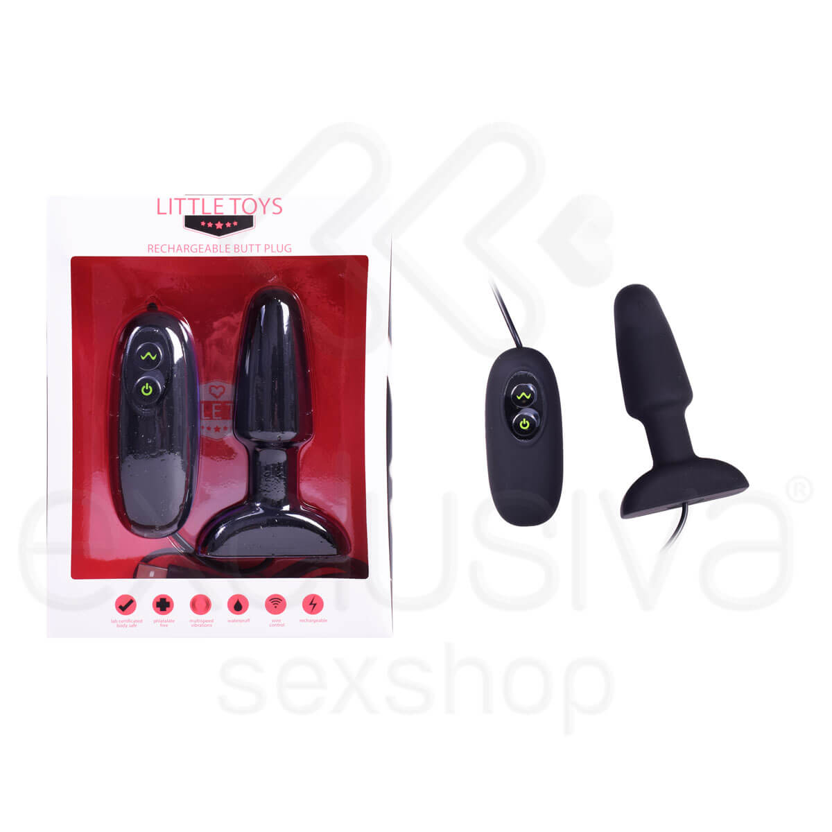 Plug anal recarregável confeccionado em silicone com 10 modos de vibração e controle remoto com fio. Possui base de segurança.