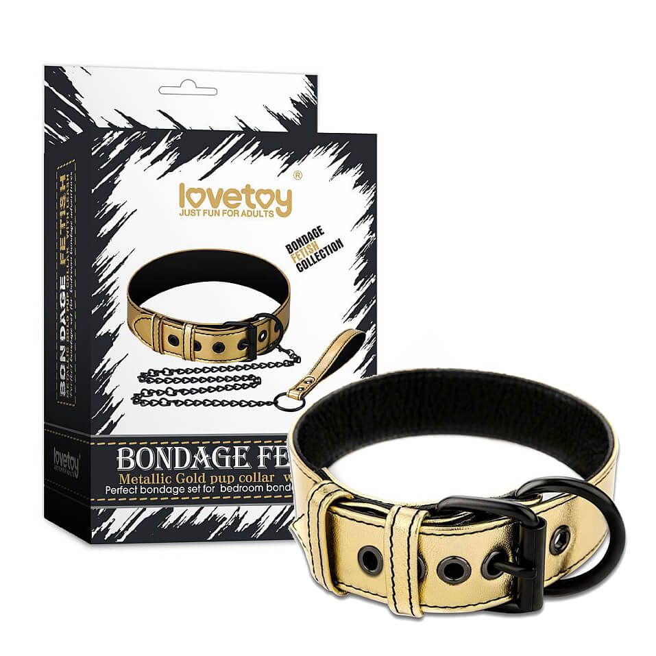 Coleira em couro sintético e vinil com fecho ajustável e guia. Corrente com até 130 cm.