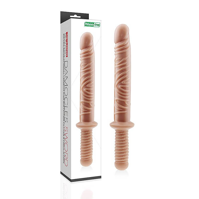 Prótese em forma de pênis com cabo de espada, glande definida e veias salientes.