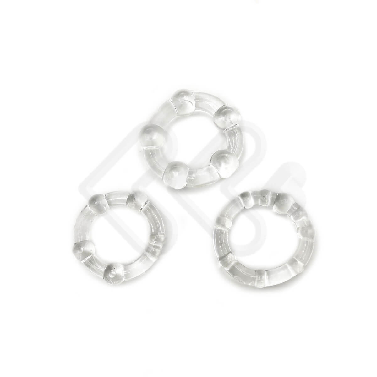 Kit com 3 anéis penianos feito em borracha super elástica atóxica, com tamanhos levemente diferentes e texturas externas. Prolongue suas noites com este kit.