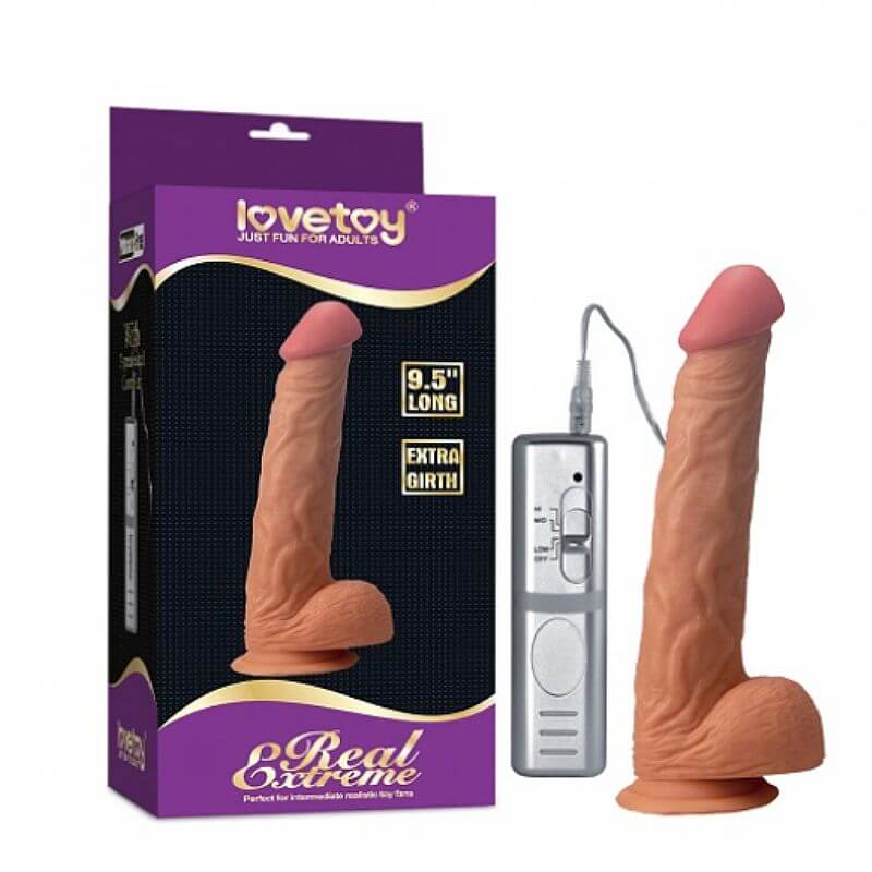 Prótese realística, confeccionado em TPE, possui glande definida, veias salientes, escroto, ventosa e 3 vibrações controladas por controle remoto de fio.