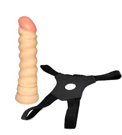 Cinta em courvin com prótese em formato de pênis espiral feito em cyberskin um material super macio e flexível, o pênis pode ser usado com ou sem a cinta.