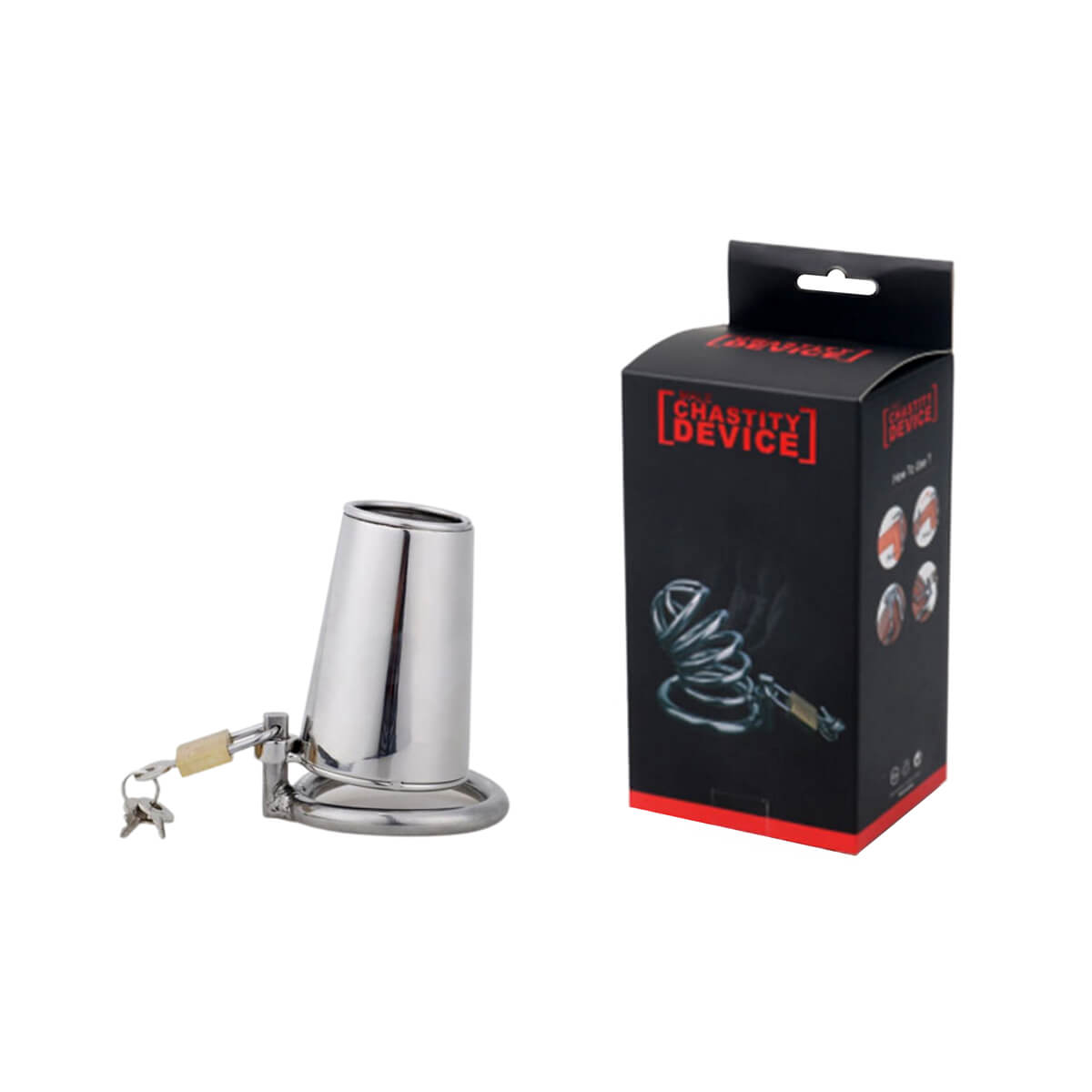 Cinto de castidade masculino, feito em aço no formato de funil com abertura em sua ponta. Possui anel para escroto e cadeado com chaves para prender o mesmo. Ideal para novas experiências sexuais e para a prática da dominação!