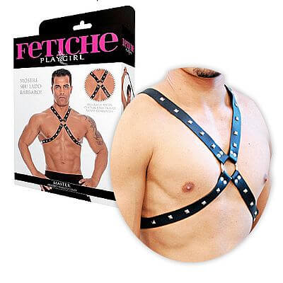 Arreio para tórax feito de courvin com detalhes de rebites realçando a força e a coragem dos grandes guerreiros bárbaros, ou dos escravos vencidos. Possui argola de metal central.