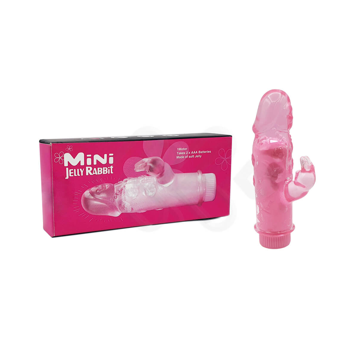 Mini vibrador em ABS atóxico com vibração única, capa peniana em jelly no formato de "Rabbit" com glande definida, texturas massageadoras e estimulador de clitóris.