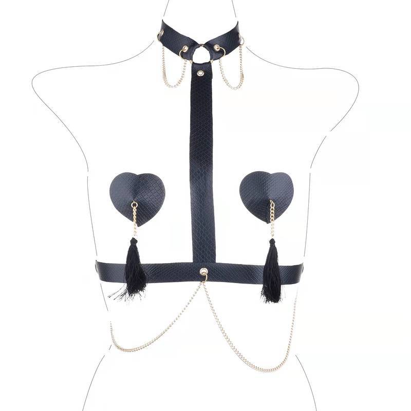 Nipple Cover em Forma de Coração com Choker sexy produzida em couro ecológico com harness estilo top e ornados, deixando a visual mais HOT!