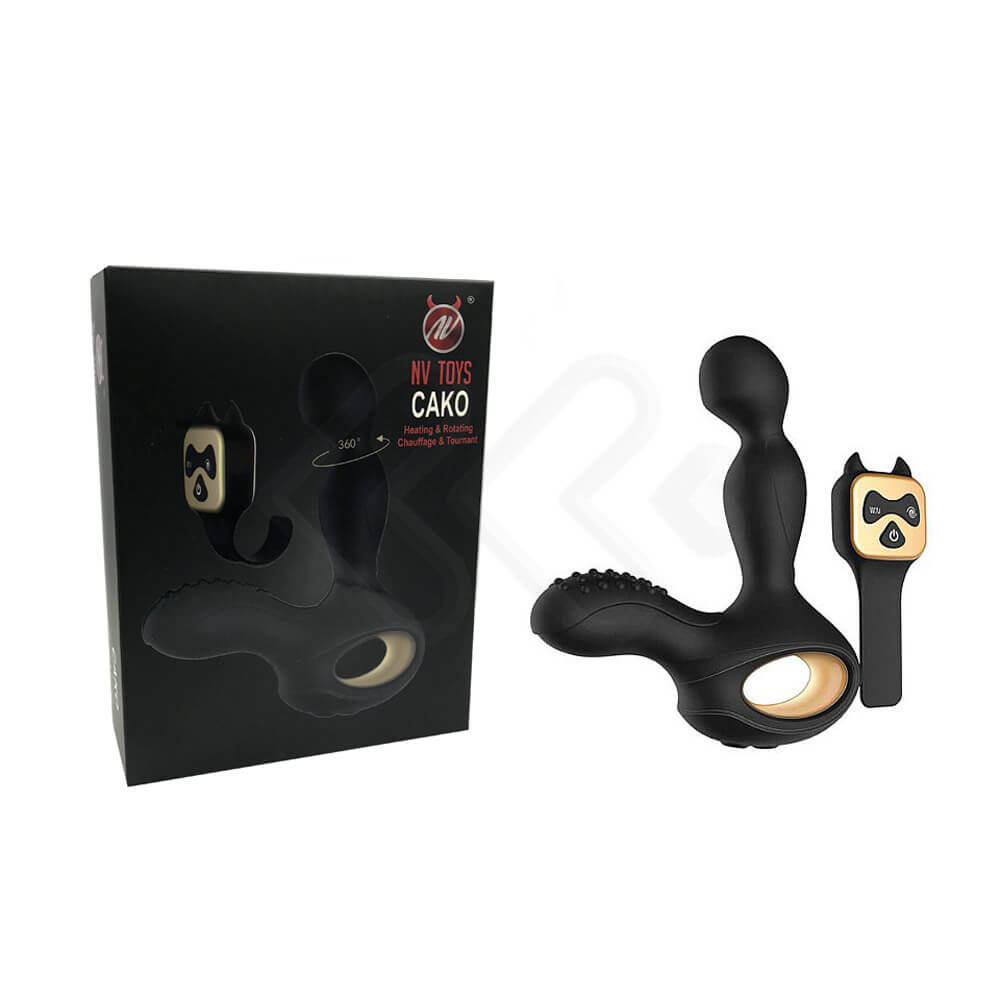 Massageador de próstata recarregável, feito em silicone soft touch e ABS atóxico com 10 modos de vibração, rotação 360°, função de aquecimento e controle remoto sem fio.