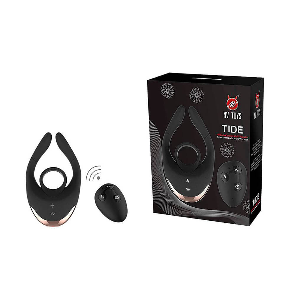 Anel peniano recarregável feito em silicone com 10 modos de vibração, 2 estimuladores flexíveis com função de "Choque" em 10 intensidades diferentes e controle remoto sem fio.