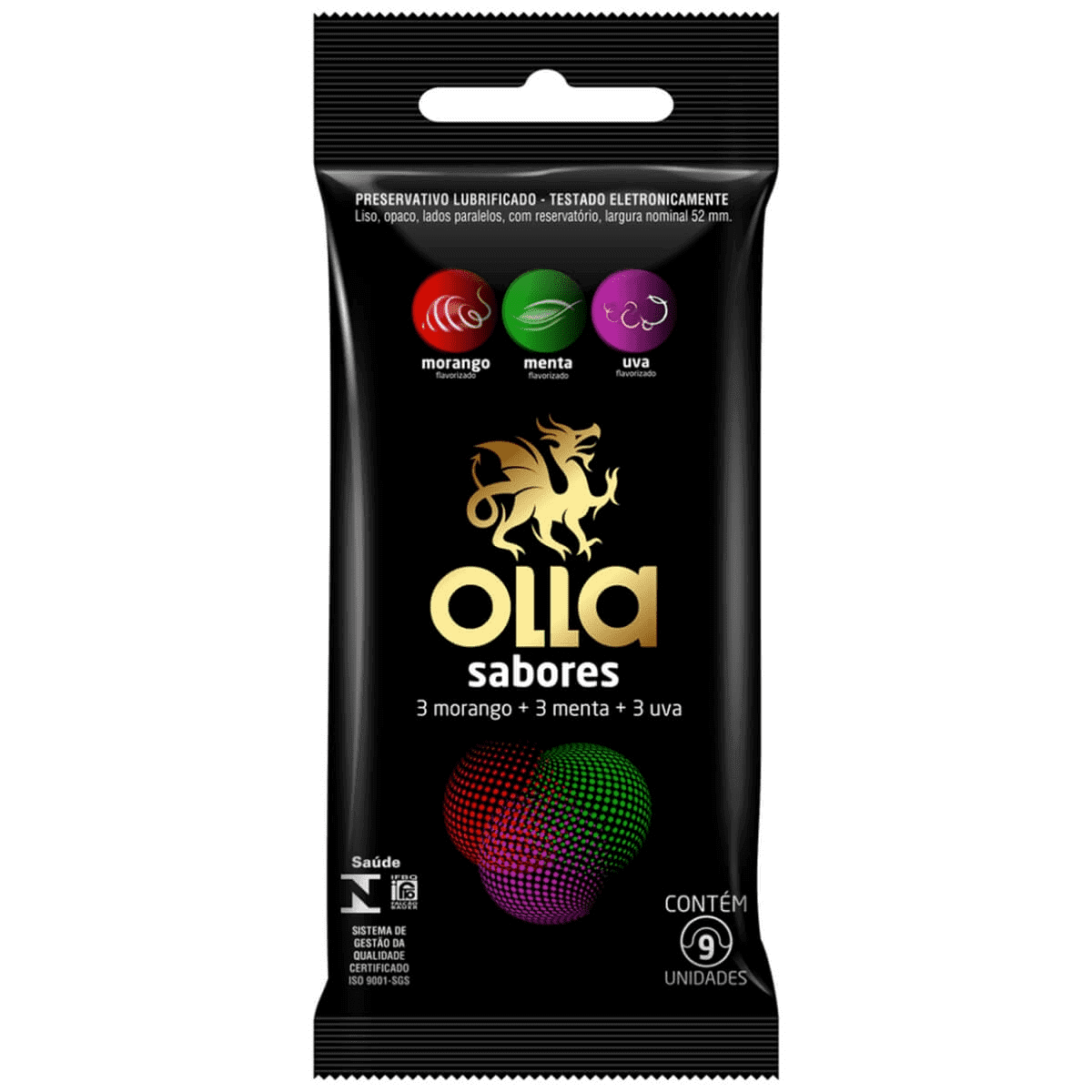 9 Preservativos Olla com 3 unidades de cada sabor, ideal para prevenir doenças sexualmente transmissíveis e a gravidez.