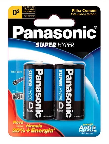 Pilhas Panasonic indicadas para aparelhos que demandam uma grande descarga de energia, possui nova fórmula que gera 20% a mais de energia e proteção anti vazamento.