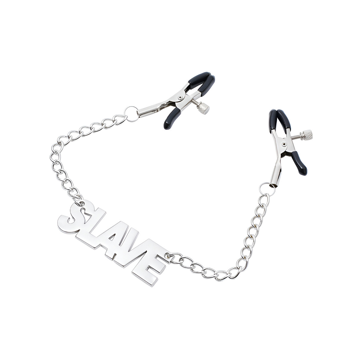 Descubra novas sensações com o Par de Grampos para Mamilos com Regulagem e Pingente Escrito SLAVE. Este acessório sedutor proporciona um controle personalizado da pressão, intensificando a experiência de prazer e submissão, ideal para apimentar suas noites.