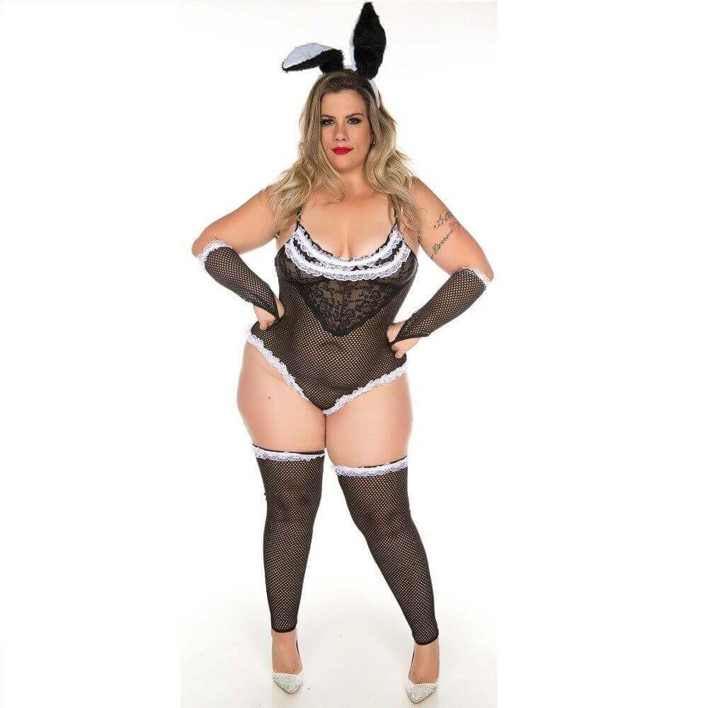 Fantasia de coelha composta por body sensual confeccionada em arrastão, par de munhequeiras, par de acessório para perna e uma tiara com orelhinha de coelha!