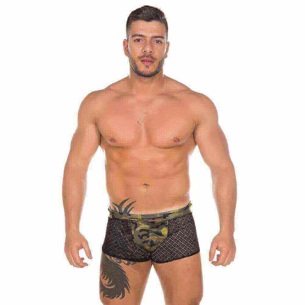 Cueca Boxer em arrastão e malha com estampa militar. Coloque o seu amor na linha!