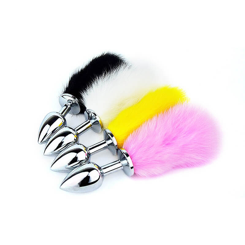 Plug anal em aço inoxidável com formato cônico e rabo de raposa artificial. Disponível nas cores Pink, Rosa Claro, Branco, Preto e Amarelo.