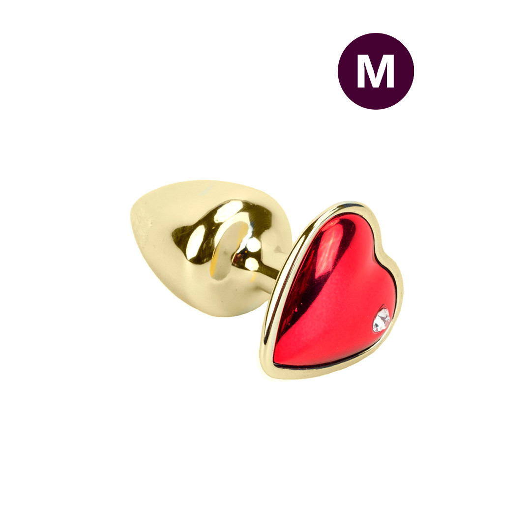 Plug anal feito em metal, formato cônico e no tamanho médio com base de coração e strass brilhante para decorar seu bumbum. Quer saber mais? Confira abaixo!